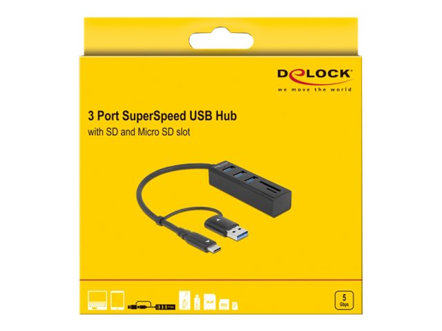 Tento pevný rozbočovač USB značky Delock s kovovým krytem lze připojit k počítači, laptopu nebo mobilnímu zařízení prostřednictvím rozhraní USB Typu-A nebo USB-C. K rozbočovači lze připojit až 3 zařízení USB.