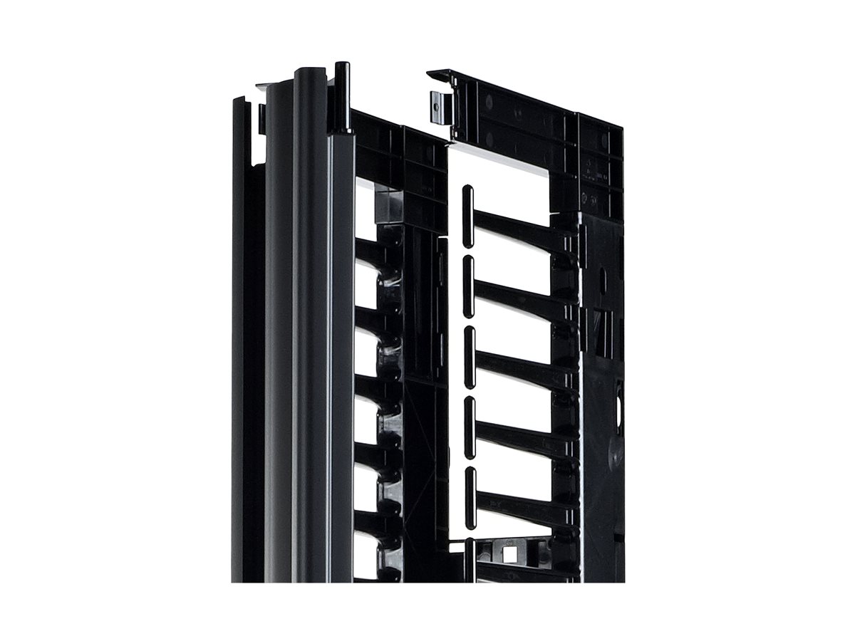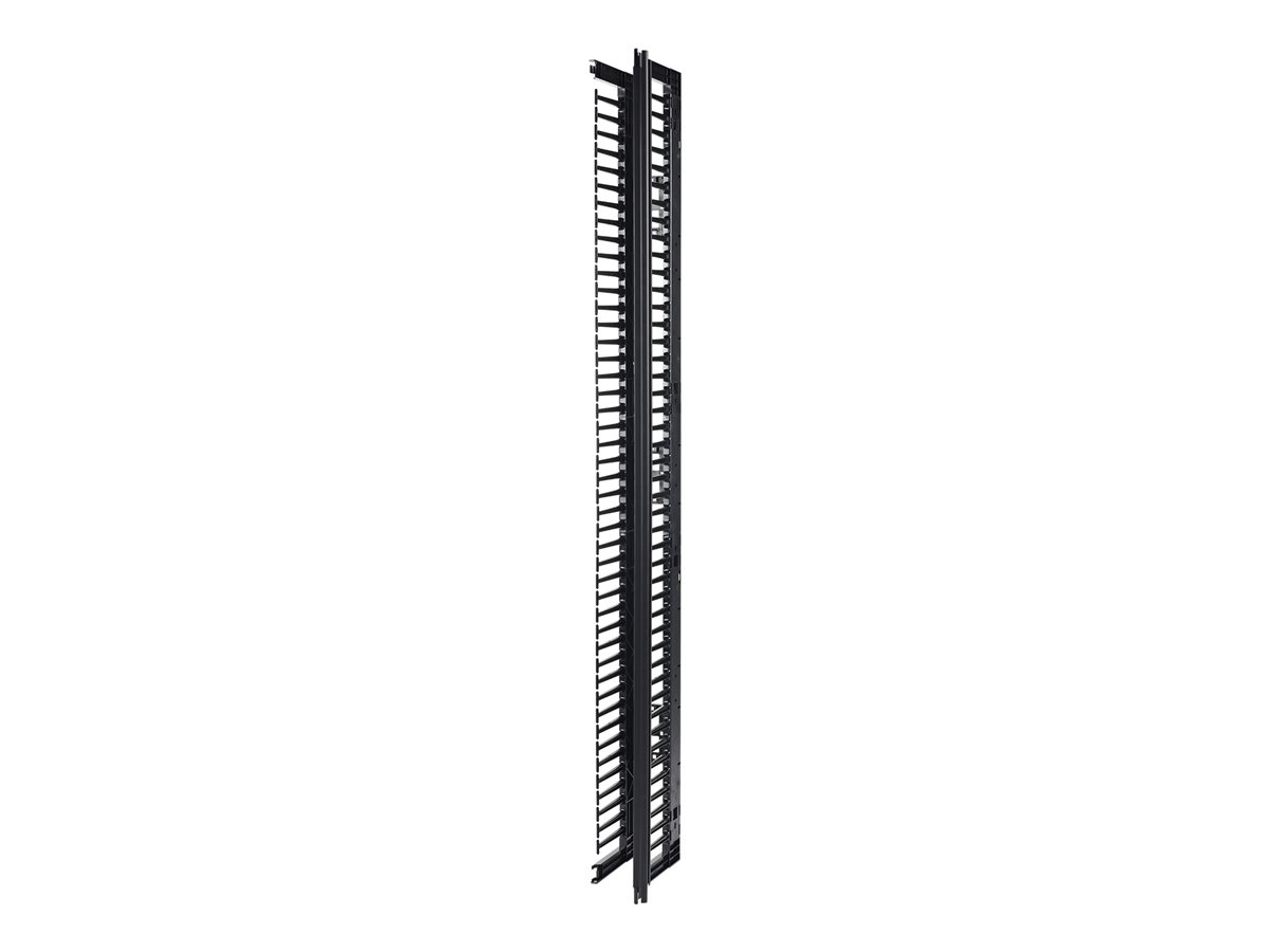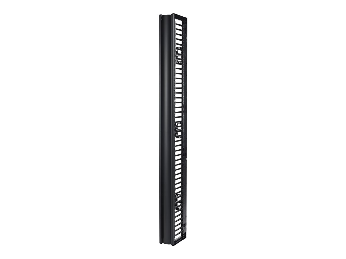 Vertikální organizátor kabelů pro racky, jednostranný s dvířky. Zadní desky obsahují několik otvorů pro montáž příslušenství pro organizaci kabeláže bez nutnosti použít nářadí, např. stahovací kabelové organizéry a pásky a optické držáky pro organizaci přebytků na optických kabelech. Měkká plastová vodítka zajišťují správný rádius ohybu. Montáž dveří je rychlá a bez použití nářadí, kování je z levé nebo pravé strany kvůli umožnění přístupu do vertikálního kanálu kabelového organizéru. Organizéry kabelů obsahují vysokokapacitní tenká vodítka kabelů, která zajišťují maximální kapacitu každého stojanu a nabízí pevnou konstrukci zamezující ohýbání kabelů procházejících kabelovým kanálem. Průchodky a montážní otvory podporují vodorovné kabelové žlaby pro vedení kabelů zepředu dozadu, které poskytuje příslušenství pro vedení kabelů. Svislé kabelové organizéry jsou zabaleny v nesmontovaném stavu a jsou navrženy tak, aby snadno zacvakly do sebe kvůli rychlé montáži a instalaci přímo na místě.