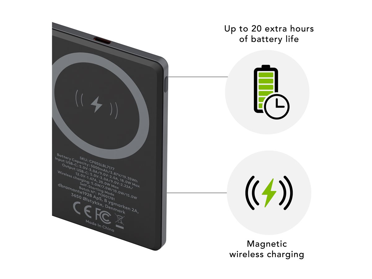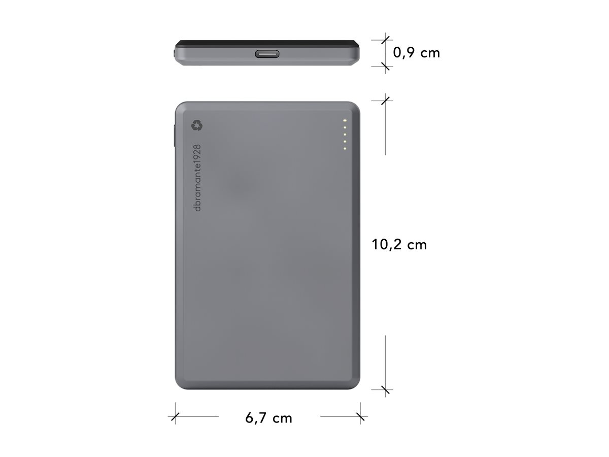 Powerbanka dbramante1928 re-charge je určena pro ty, kteří potřebují spolehlivé nabíjení na cestách. S kapacitou 5000 mAh je tato powerbanka vhodná pro celodenní napájení mobilních telefonů. Kompatibilita s MagSafe zajišťuje plynulé nabíjení, zatímco použití 100% recyklovaného plastu je v souladu s moderními snahami o udržitelnost. Tato powerbanka splňuje globální standard pro recyklaci, což dokazuje závazek k ekologickým postupům.
