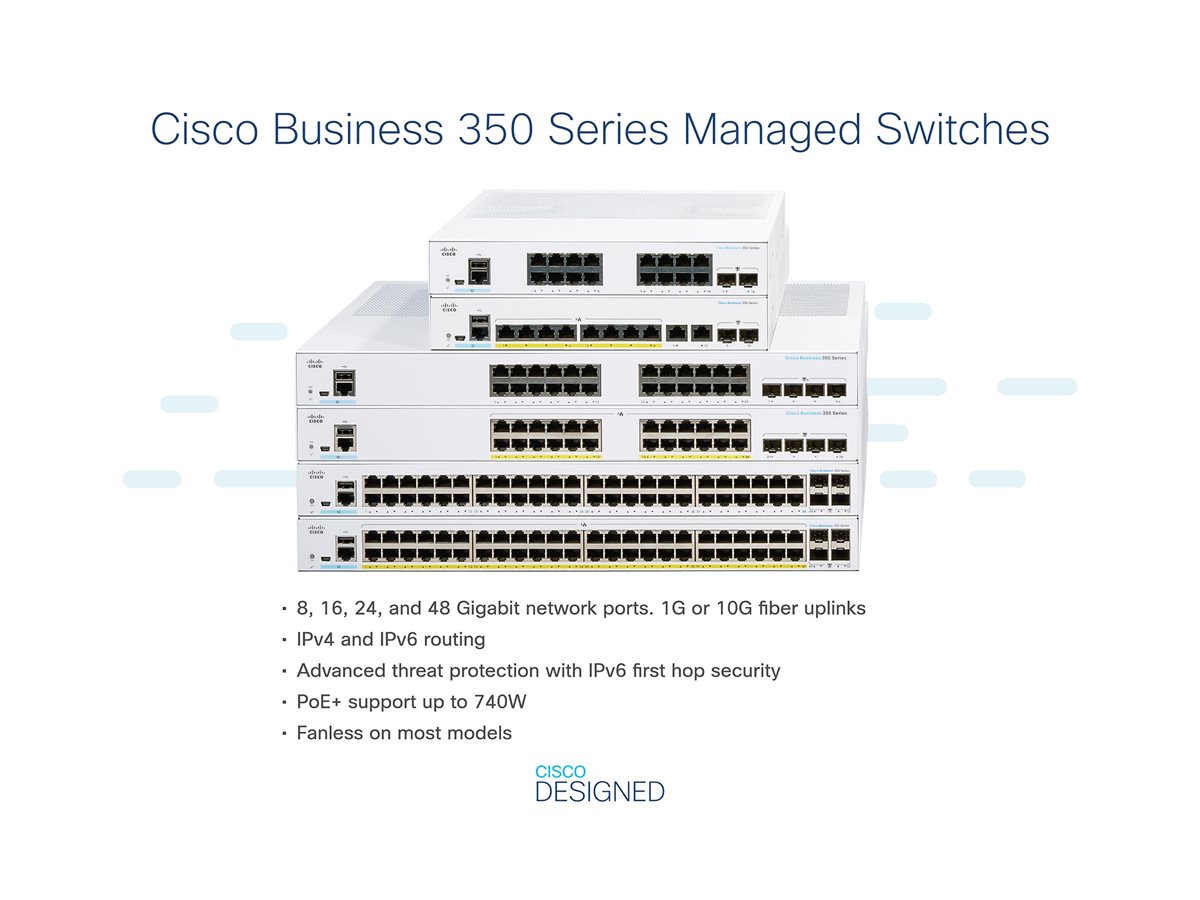 Přepínače řady Cisco Business 350 jsou cenově dostupné spravované přepínače, které představují důležité stavební prvky pro každou síť v malé kanceláři. Intuitivní ovládací panel zjednodušuje nastavení sítě a pokročilé funkce urychlují digitální transformaci, zatímco všudypřítomné zabezpečení chrání důležité obchodní transakce. Přepínače řady Cisco Business 350 představují ideální kombinaci cenové dostupnosti a možností pro malé kanceláře a pomáhají vytvářet efektivnější a lépe propojené pracovníky.