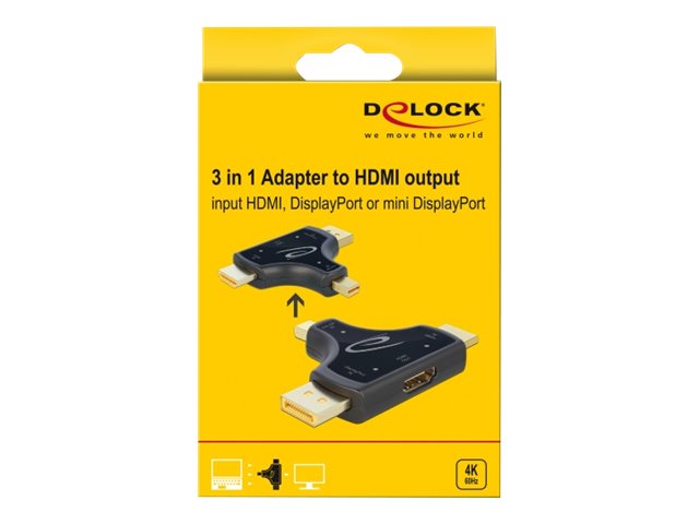 | Popis výrobku | Delock 3 in 1 Monitor Adapter with HDMI / DisplayPort / mini DisplayPort in to HDMI out with 4K 60 Hz - video / audio adaptér |