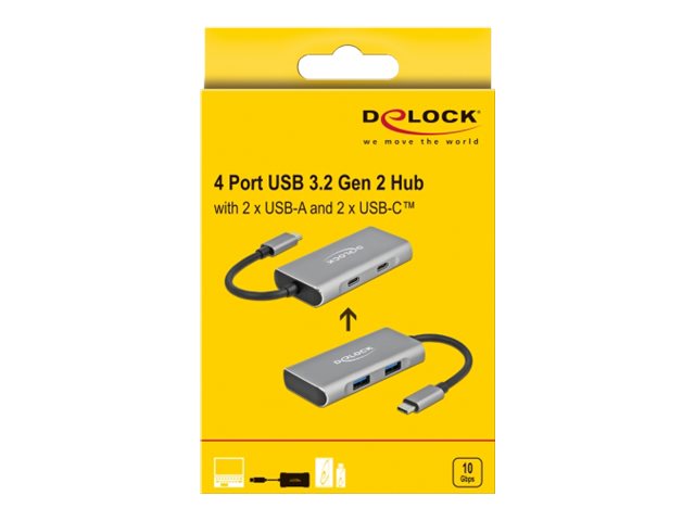 USB hub od Delocku může být připojen přes rozhraní USB Type-C k PC nebo notebooku. Má dva konektory USB Typu-A a dva konektory USB Type-C. Můžete tak připojit různá zařízení USB jako jsou dokovací stanice, čtečky karet, externí HDD atd.