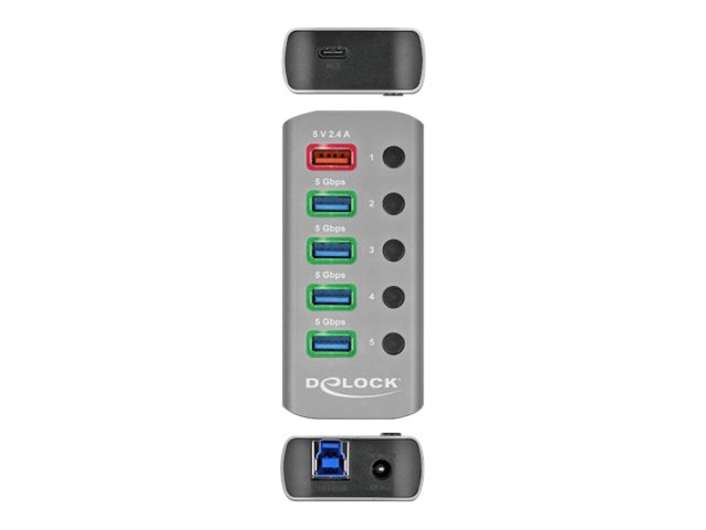 | Rozhraní | 1 x vstup USB 3.2 Gen 1 Type B ¦ 4 x výstup USB 3.2 Gen 1 Type A ¦ 1 x USB-C (pouze napájení/napájení 3.0) max 12 V / 2.25 A ¦ 1 x USB (pouze napájení) Type A max 5V / 2.4 A |