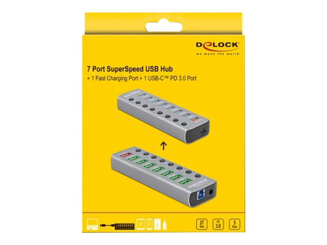 Tento spolehlivý USB hub od Delocku s kovovým pouzdrem může být připojen k počítači přes rozhraní USB Typ-A. Rozšiřuje počítač o 7 portů USB Typ-A. Připojená zařízení jako smartphony mohou být napájena nebo data mohou být přenášena rychlostí 5 Gbps.