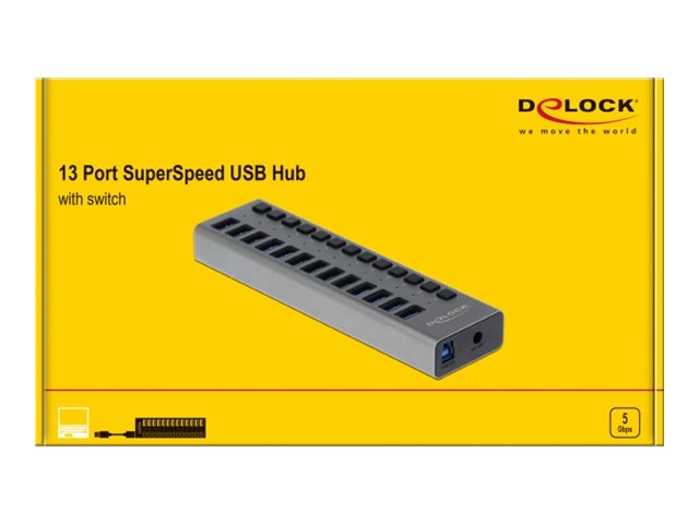 Tento spolehlivý USB hub od Delocku s kovovým pouzdrem může být připojen k počítači přes rozhraní USB Typ-A. Rozšiřuje počítač o 13 portů USB Typ-A. Připojená zařízení jako smartphony mohou být napájena nebo data mohou být přenášena rychlostí 5 Gbps. Každý port může být zapnut nebo vypnut jednotlivě pomocí vypínačů.