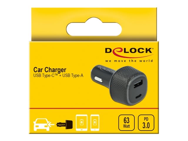 Tuto automobilovou USB nabíječku značky Delock lze používat k nabíjení dvou zařízení s rozhraním USB. Jeden port je vybaven rozhraním USB Type-C Power Delivery (PD), takže podporovaná zařízení lze nabíjet výkonem až 60 Watt. Kromě toho je k dispozici jeden port USB Typu-A s technologií rychlého nabíjení o výkonu až 18 Watt pro smatphony.