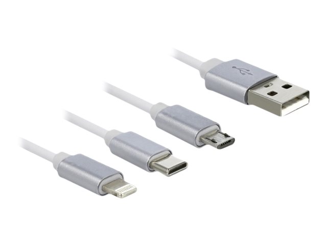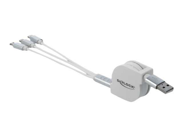 Tento praktický zatažitelný kabel 3 in 1 značky Delock lze připojit ke zdroji proudu prostřednictvím USB-A a lze jej používat k nabíjení různých zařízení s rozhraními Lightning, Micro USB nebo USB Type-C. Podporováno je i nabíjení tří zařízení najednou, při kterém je celkový výstupní proud 2 A dále rozváděn do všech linek.