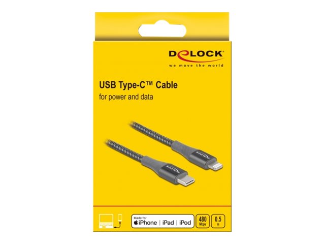 Tento USB datový a nabíjecí kabel značky Delock lze použít k připojení zařízení značky iPhone, iPad nebo iPod k počítači nebo laptopu s portem USB Type-C nebo Thunderbolt 3 například k počítači MacBook. Zařízení je nabíjeno a je možno přenášet data.