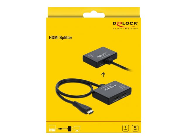 Tento rozbočovač od Delocku přijímá signál HDMI z PC nebo notebooku a rozděluje ho na dva připojené displeje. Tímto jedním připojením HDMI lze použít k obsluze dvou HDMI monitorů.