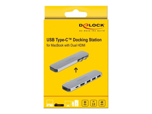 Tuto dokovací stanici Delock lze připojit k počítači MacBook se dvěma přídavnými porty Thunderbolt 3. Na výstupních portech HDMI lze provozovat dva monitory současně. Tři integrované porty USB Typu-A umožňují využívání periferií.
