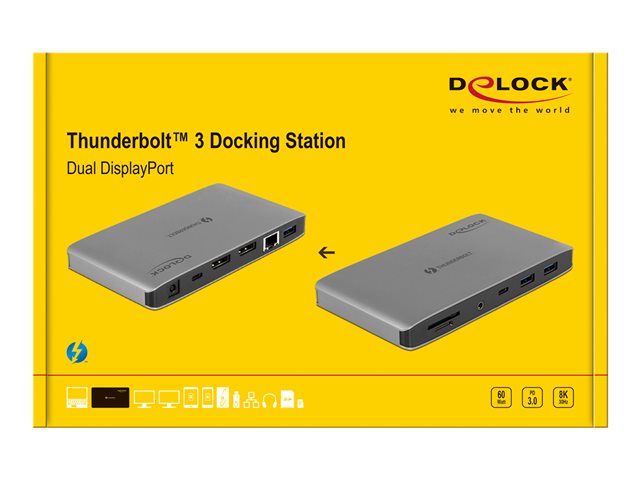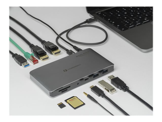 Tato Thunderbolt 3 dokovací stanice od Delocku může být připojena k počítači s portem Thunderbolt 3 a poskytovat řadu rozhraní. Na výstupech rozhraní DisplayPort lze mít připojeny až dva monitory současně. Čtyři integrované porty USB umožňují užívání periferních zařízení, připojení pro sluchátka a sítě Gigabit, jakož i sloty pro karty SD a Micro SD.