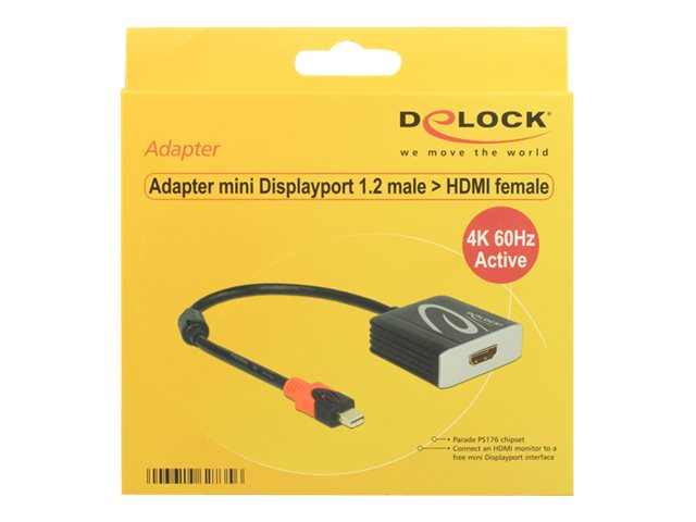| Popis výrobku | Delock Adapter mini Displayport 1.2 male > HDMI female 4K Active - nástroj pro převod videa - Parade PS176 - černá |