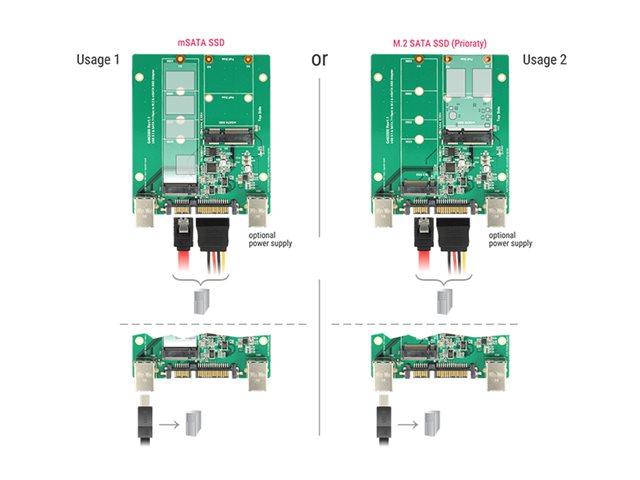 Tento Delock konvertor umožňuje připojit M.2 SSD ve formátu 2280, 2260, 2242 a 2230 nebo mSATA SSD ve formátu half size nebo full size. Jestliže jsou obsazeny oba sloty, pak může být používán jen M.2 SSD. Konvertor může být istalován do systému skz SATA nebo USB rozhraní.