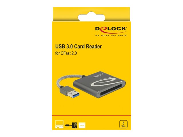 Čtečka karet od Delocku může být použita pro čtení a zápis na CFast paměťové karty. Čtečka karet může být připojena k PC nebo notebooku přes rozhranní USB Typ-A.