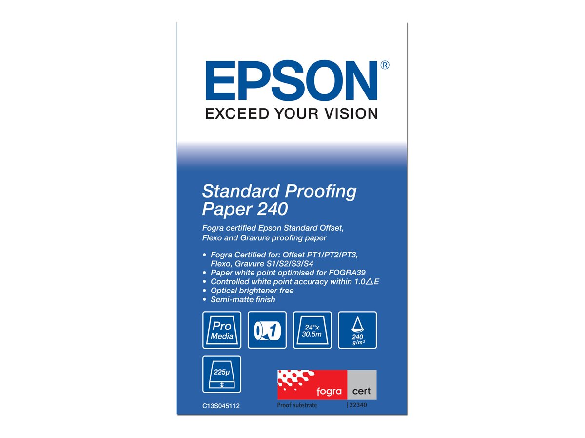 | Popis výrobku | Epson Proofing Paper Standard - nátiskový papír - polomatný - 1 role - Role (61 cm x 30,5 m) - 240 g/m² |