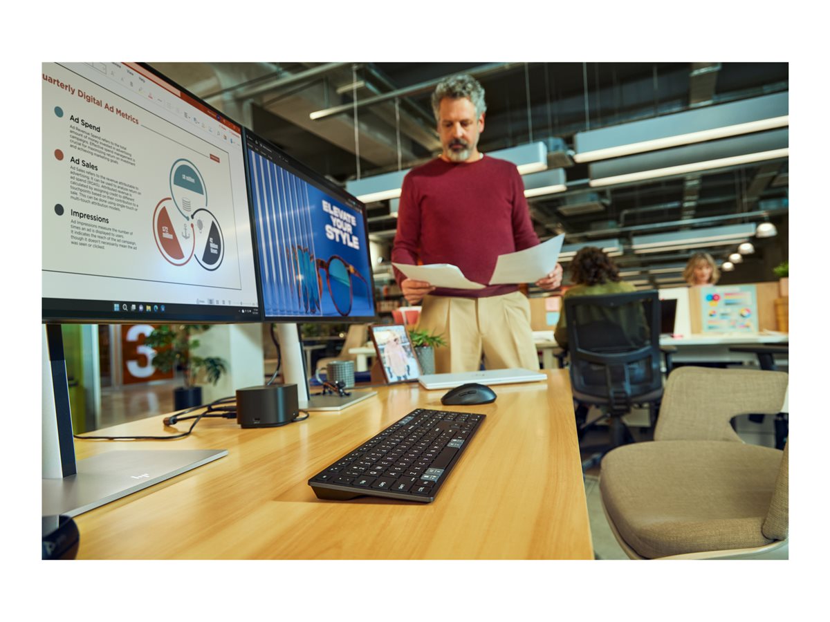 Klávesnice HP 725 je vybavena bezdrátovým přijímačem USB a technologií Bluetooth a nabízí spolehlivou provozní vzdálenost až 10 m, čímž poskytuje volnost pohybu a všestrannost v jakémkoli pracovním prostoru. Jeho konstrukce odolná proti polití dodává další vrstvu odolnosti a chrání před náhodným politím. Zahrnutí vyhrazených kláves pro funkce kalkulačky, diktování, zámek PC a Copilot dále umocňuje jeho produktivní funkce, což z něj činí cenný doplněk každé sestavy.
