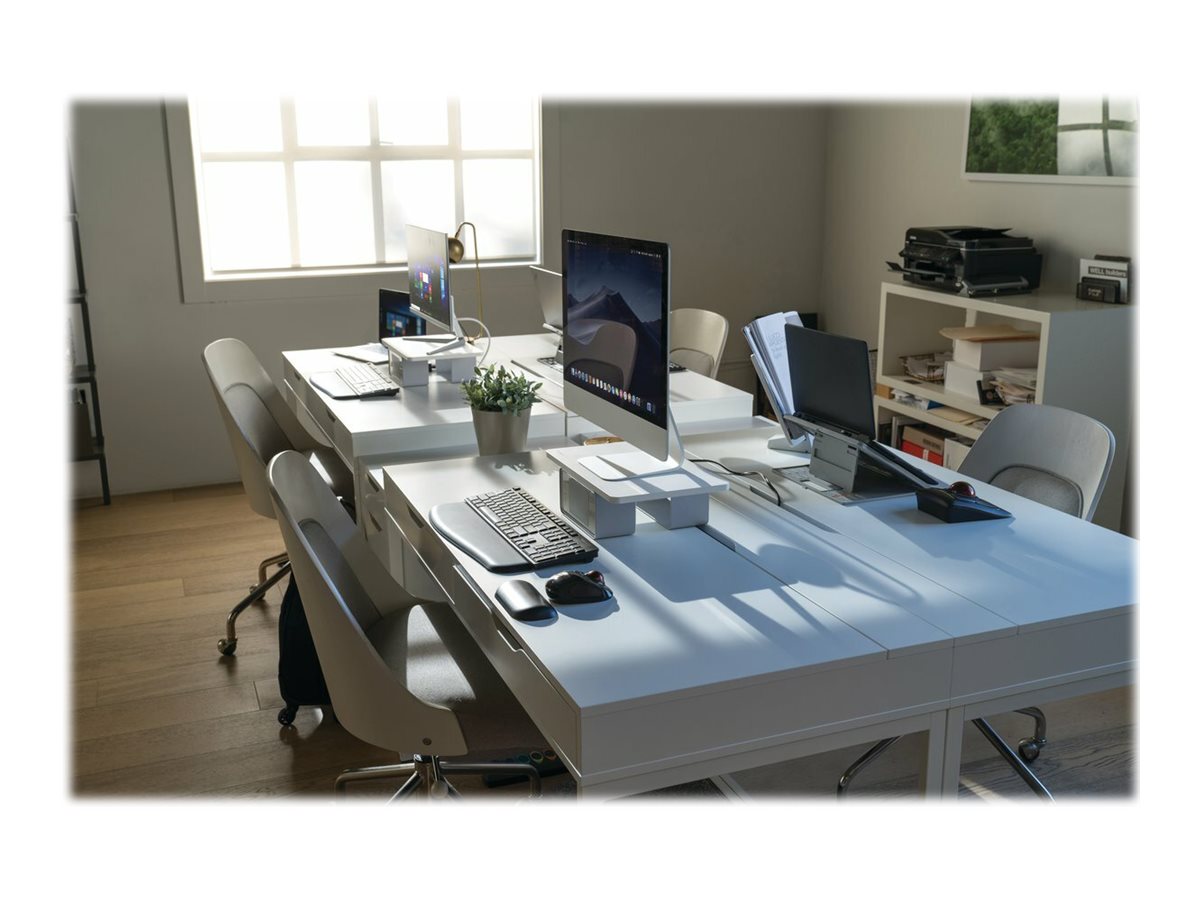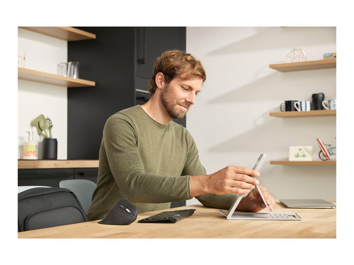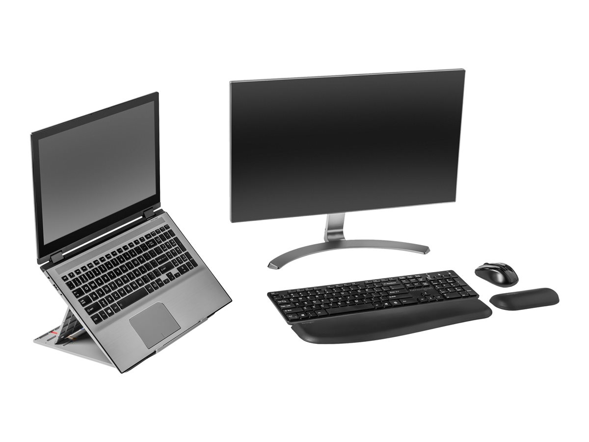Spojte ergonomické přínosy s technologickými a používejte nastavitelný stojánek pro notebook Kensington SmartFit Easy Riser Go. Elegantní provedení typu 2-v-1 nabízí nejen nastavení výšky a sklonu, které zlepšuje držení těla, přispívá ke správnému zaměření pohledu a zvyšuje pohodu šíje i ramen, ale i lepší chlazení vnitřních částí notebooku. Neklouzavé nožky brání posouvání stojánku, polstrované vložky zaručují bezpečné uložení vašeho zařízení a útlá skládací konstrukce je výhodná při cestování. Stojánek byste měli používat s externí klávesnicí a myší. Je vhodný pro standardní i herní notebooky s úhlopříčkou 14".