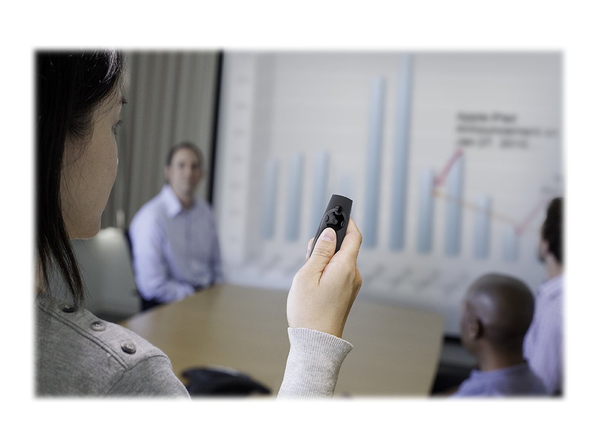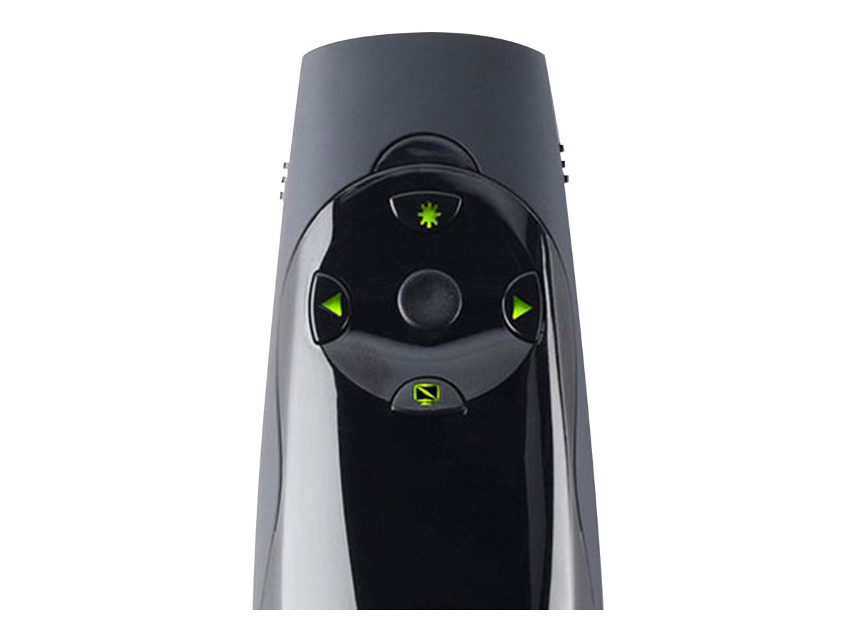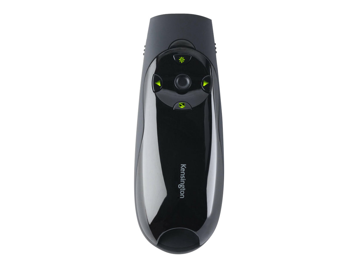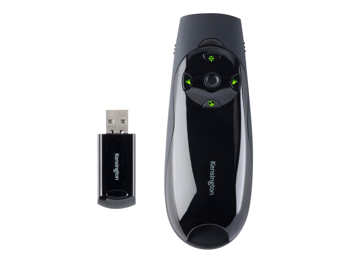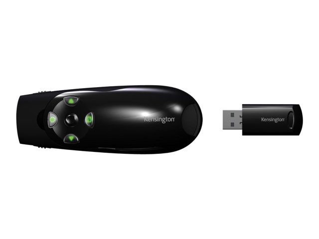 Nemůžete zdůraznit klíčové myšlenky, pokud to nikdo nevidí. Tento problém vyřešíte pomocí jasného zeleného laseru prezentačního zařízení Kensington Expert se zeleným laserovým ukazovátkem s ovládáním kurzoru, které je vhodné i pro ty největší místnosti a nejjasnější obrazovky. Některé z dnešních jasných LCD a plazmových obrazovek představují pro červená laserová ukazovátka skutečnou výzvu. Ne však pro zelený laser prezentačního zařízení Kensington Expert se zeleným laserovým ukazovátkem. Tento laser Je 10krát jasnější než standardní červené lasery, takže obstojí i proti nejsvětlejším LCD a plazmovým displejům. Samozřejmě že bezdrátový ovladač prezentací je víc než jen svítivé ukazovátko. Intuitivní design prezentačního zařízení Expert se čtyřmi tlačítky umožňuje snadnou orientaci v prezentacích Keynote nebo PowerPoint. A když budete potřebovat přesunout kurzor, jednoduchým uchopením tlačítka získáte plné ovládání kurzoru. Výkonné dálkové ovládání s frekvencí 2,4 GHz odolává rušení a umožňuje ovládat aplikace Keynote nebo PowerPoint až na vzdálenost 50 metrů (150 stop). USB přijímač ukládá data uvnitř prezentačního zařízení, takže se nemusíte obávat jejich chybného umístění. Prezentační zařízení Kensington Expert má podsvícená tlačítka, a tak se nemusíte bát, že byste na dálkovém ovládání nenašli to správné tlačítko.