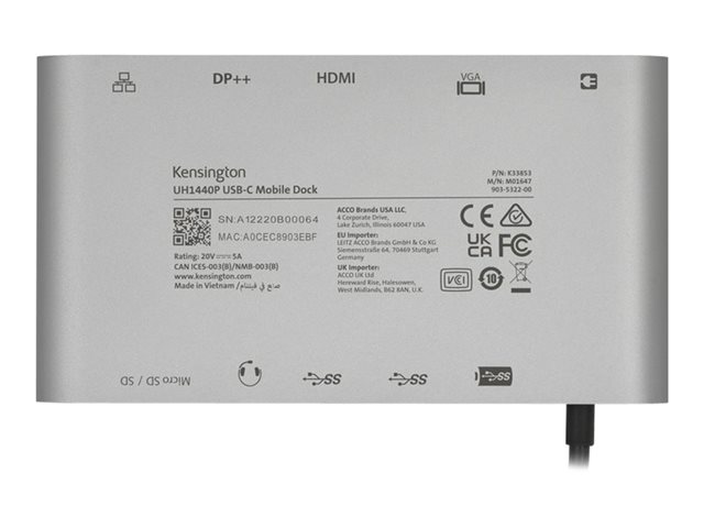 | Popis výrobku | Kensington UH1440P - dokovací stanice - USB-C 3.2 Gen 1 / Thunderbolt 3 / Thunderbolt 4 - DP, HDMI, VGA - 1GbE |