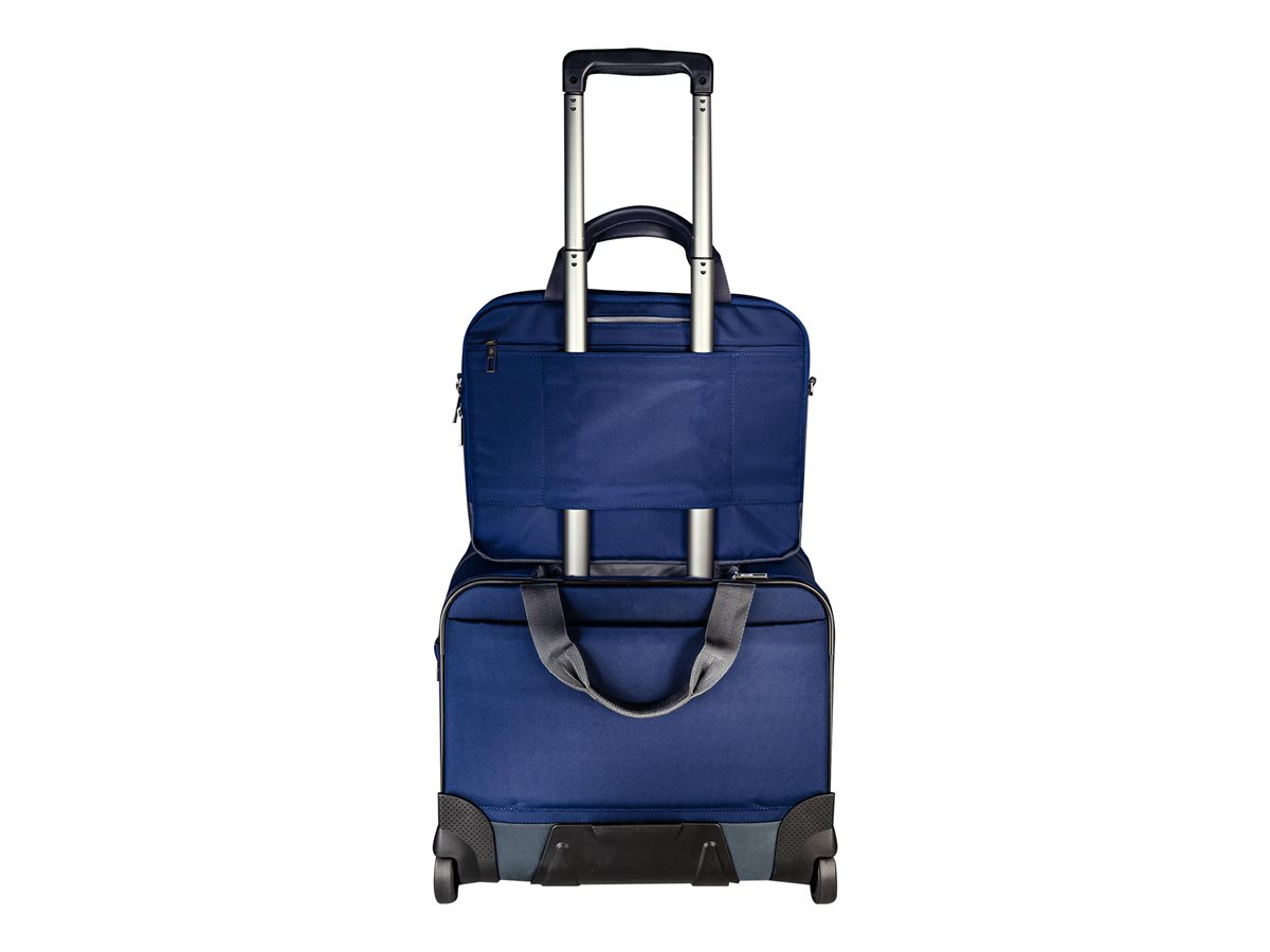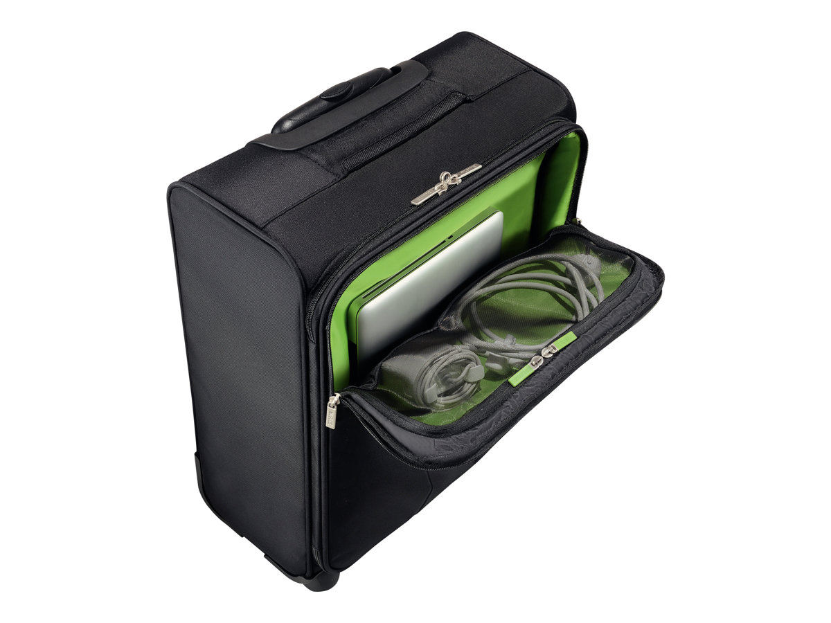 Kvalitní, lehký cestovní kufr s dvěma hlavními prostornými kapsami a jednou menší přední kapsou. Umožňuje jasně oddělit pracovní vybavení a oblečení. Výrazný a elegantní design doplňují kvalitní zipy a stylové matně kovové přezky. Pohodlné cestování zaručují kvalitní pevná kolečka, elegantní rukojeť a madlo pro upevnění dalších zavazadel.