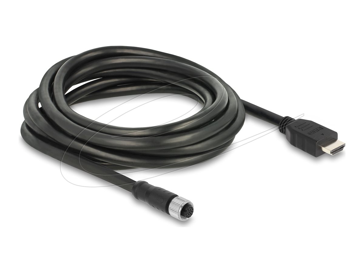 Kabel video adaptéru Delock nabízí spolehlivý způsob připojení zařízení s různými rozhraními. Díky stíněné konstrukci kabelu zajišťuje snížené rušení při zachování vysoké integrity signálu. Levý konektor má 17pinovou konfiguraci M12 a připojuje se k 19pinovému konektoru HDMI typu A na pravé straně, což umožňuje plynulé zobrazení videa v rozlišení 1080p a obnovovací frekvenci 60 Hz.