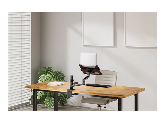 Neomounts DS20-425BL1 je plně pohyblivý stolní držák pro notebooky. Všestranná technologie naklápění (120°), otáčení (360°) a natáčení (180°) umožňuje nastavit držák do optimální výšky a pozorovacího úhlu pro váš notebook. Držák má navíc manuální nastavení výšky a hloubky pro vytvoření dokonalé pracovní polohy.