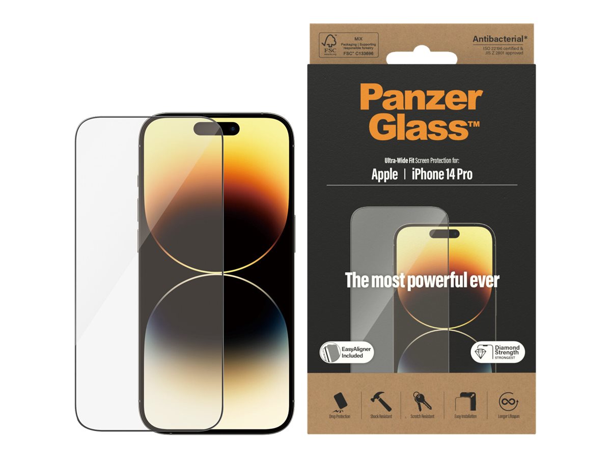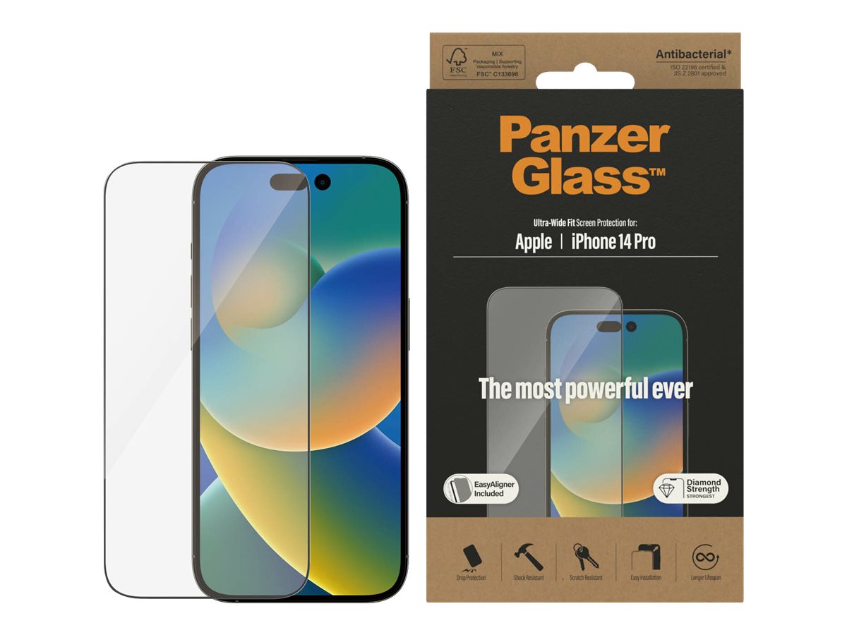 | PanzerGlass ochranné sklo pro Apple iPhone 14 Pro (Ultra Wide Fit) s instalačním rámečkem v balení |