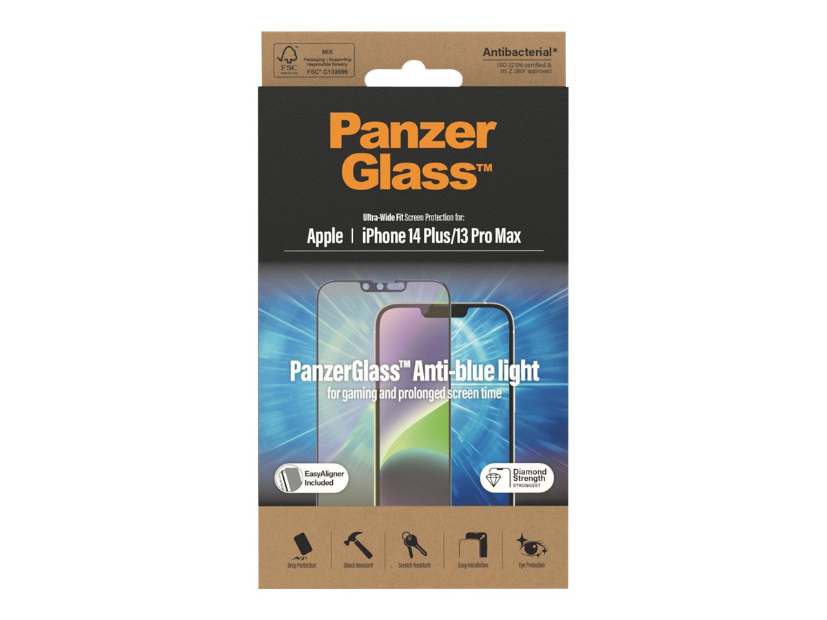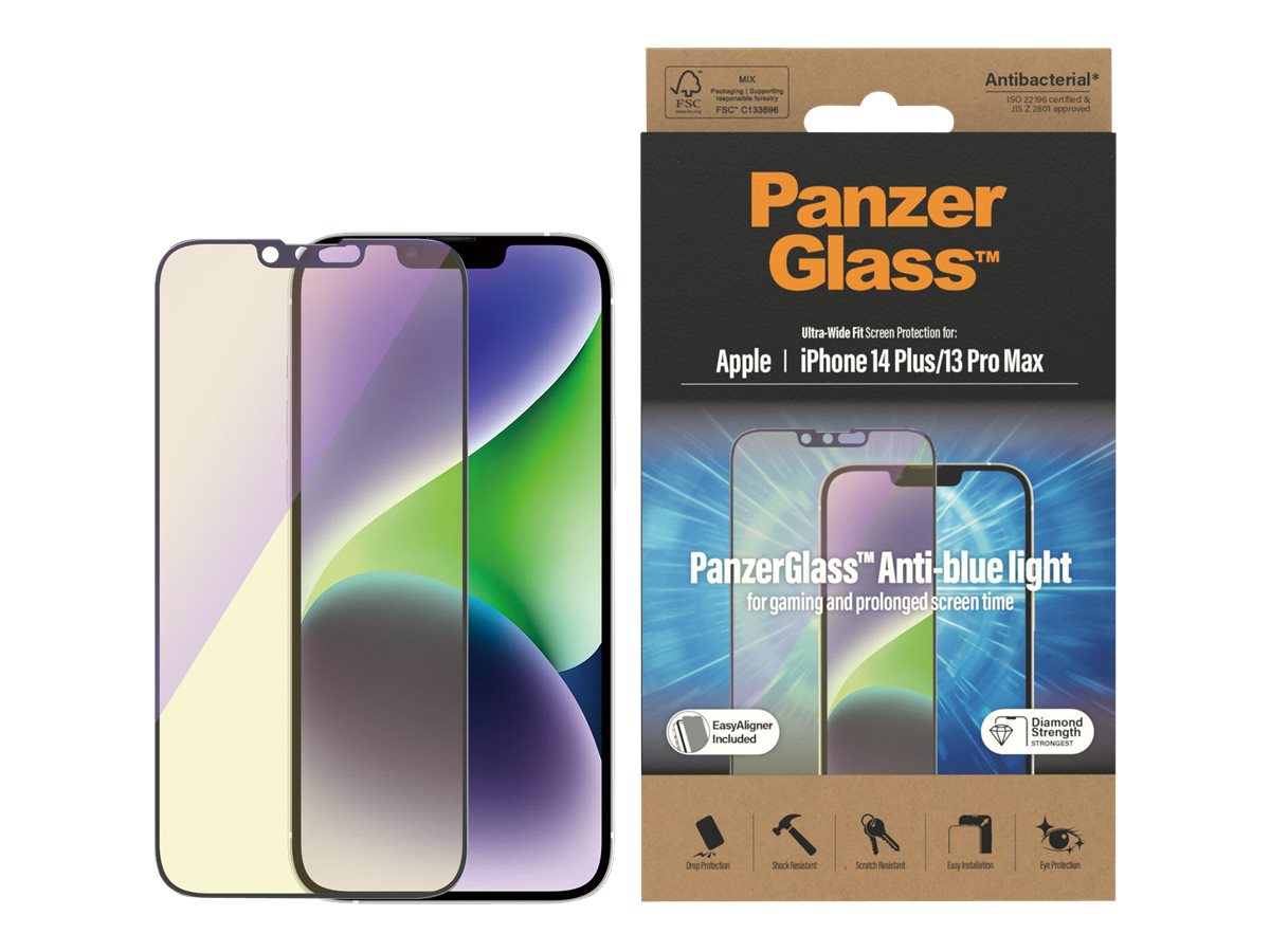 | PanzerGlass ochranné sklo pro Apple iPhone 14 Plus / iPhone 13 Pro Max (Ultra Wide Fit) s filtrem proti modrému záření a instalačním rámečkem |