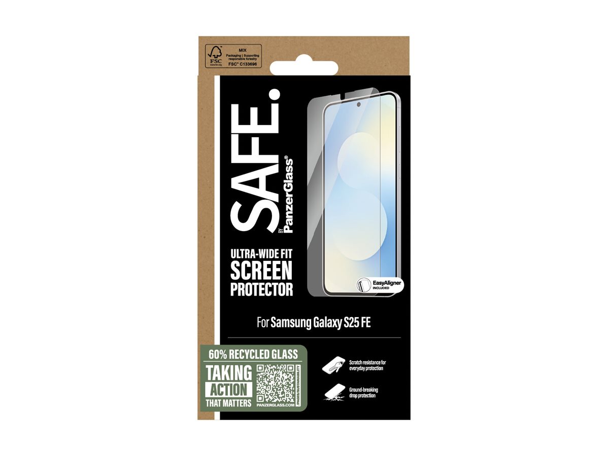 Ochranná fólie SAFE. od PanzerGlass nabízí robustní vrstvu ochrany pro mobilní telefony, která se vyznačuje ultra širokým rozměrem a funkcí EasyAligner pro snadnou instalaci. Tato ochranná fólie, vyrobená z tvrzeného skla a polyethylentereftalátu, kombinuje pevnost s přesností. Poskytuje ochranu před poškrábáním, vodou, nečistotami a pády, zajišťuje, že vaše zařízení zůstane v perfektním stavu, a zároveň poskytuje jasnost a citlivost dotykové obrazovky. Díky oleofobní vrstvě se skvrny a otisky prstů snadno setřou, takže povrch zůstává čistý a nic neruší zážitek ze sledování. Tato ochrana displeje, navržená tak, aby bezproblémově fungovala s pouzdry, obsahuje 60 % recyklovaného skla, což odráží závazek k udržitelnosti bez kompromisů v oblasti výkonu. Zažijte klid s účinnou odolností proti nárazům a celkově odolným designem, díky čemuž je tato ochrana ideálním doplňkem pro každodenní použití.