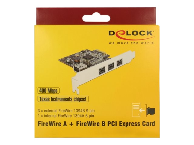 Tato PCI Express karta od Delocku rozšiřuje PC o tři externí FireWire 800 porty a jeden interní FireWire 400 port. Ke kartě pak mohou být připojena různá zařízení s portem FireWire, jako jsou externí disky, digitální kamery a fotoaparáty, adaptéry apod.