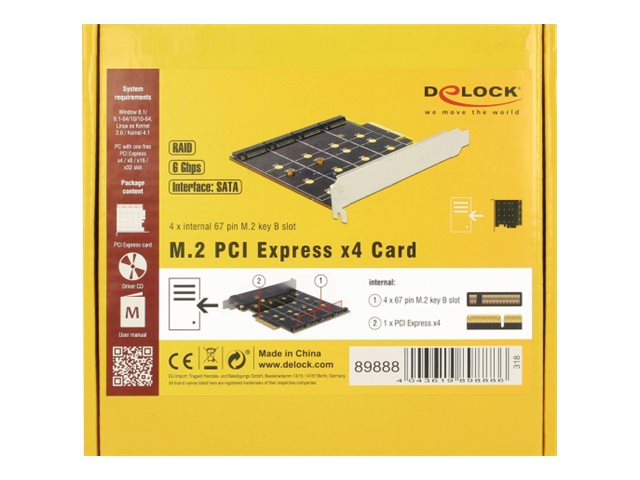 Tato PCI Express karta od Delocku rozšiřije PC o čtyři sloty M.2. Ke kartě mohou být připojeny čtyři moduly M.2 SATA ve formátu 2280, 2260, 2242, 2230. Při použití více jak jednoho SSD, máte možnost použít různé druhy RAID level.