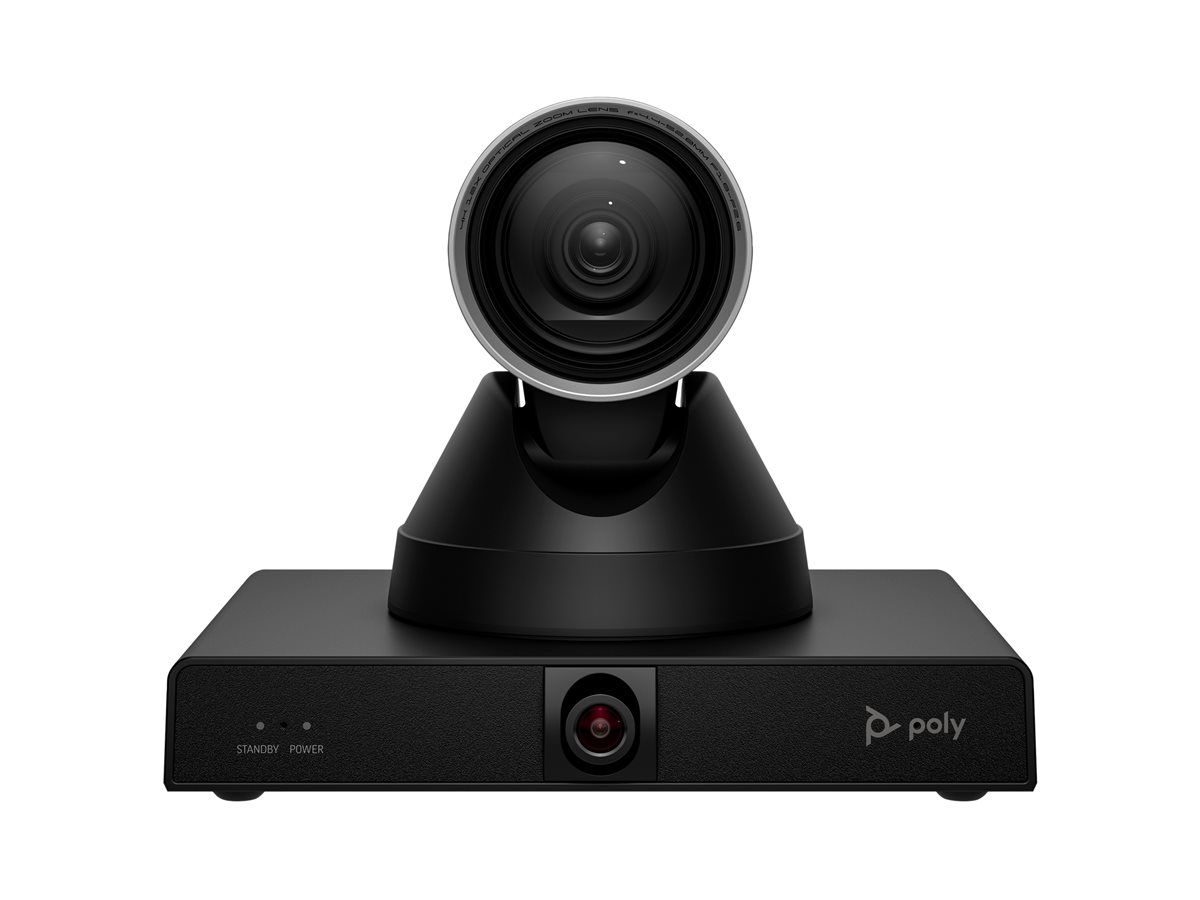 Motorizované panorama, motorizované naklánění, motorizovaný zoom, dvojitá čočka, 71° horizontal field of view (PTZ camera), 107° horizontal field of view (panoramic camera), 42.7° diagonal field of view (PTZ camera), up to 8 m camera range, Group framing, sledování přednášejícího, technologie Poly DirectorAI |