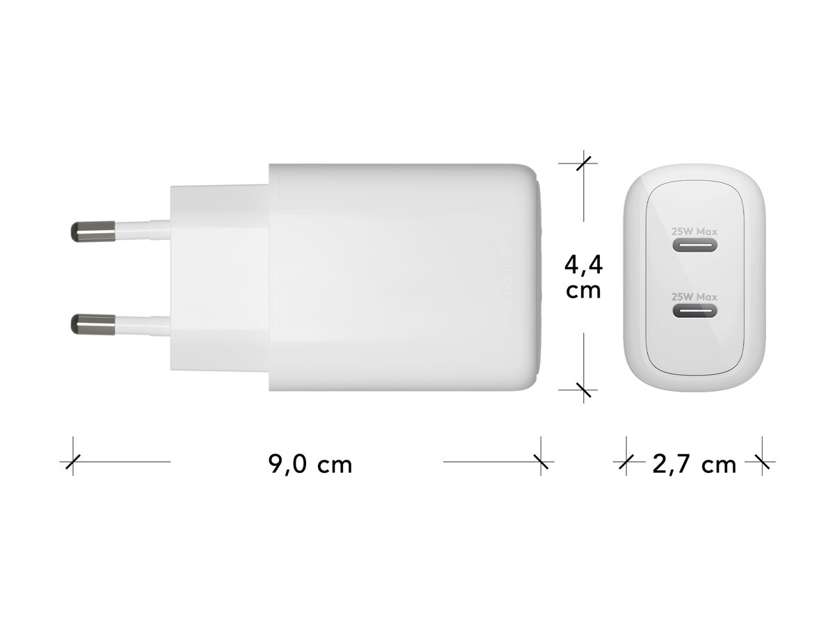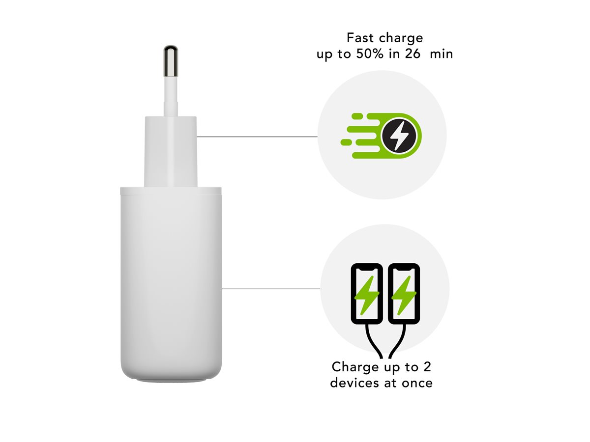 Díky technologii GaN poskytuje tento napájecí adaptér výkon 25 W a zároveň zajišťuje rychlé nabíjení. Umožňuje současné nabíjení až 2 zařízení prostřednictvím dvou 24pinových výstupních konektorů USB-C. Funkce ochrany proti přehřátí zajišťuje bezpečnost při nabíjení, což z něj činí spolehlivou volbu pro každodenní použití.