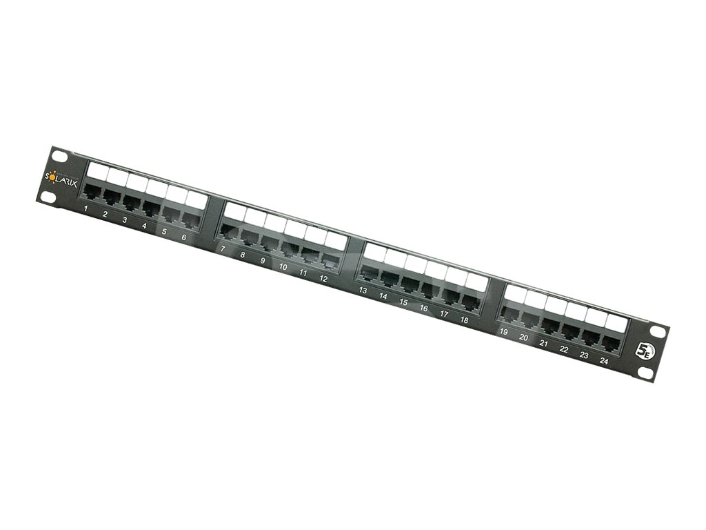 Nestíněné patch panely produktové řady Solarix - kategorie 5E jsou osazeny moduly s duální IDC svorkovnicí typu 110/Krone. Každý kontakt je na této svorkovnici z důvodu snadného zakončení kabelu označen barvami podle typu zapojení. Tyto komponenty strukturované kabeláže Solarix jsou vyrobeny tak, aby zaručovaly dlouhou životnost, vynikající funkčnost a především spolehlivost.