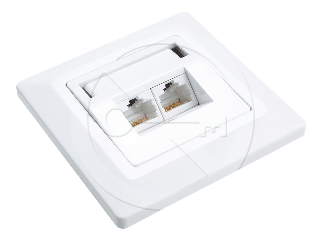 | Zásuvka pod omítku osazená 2xRJ45 UTP Cat5e. Úhel portů je 45° pro šetrnější vedení patch cordů od zásuvky |