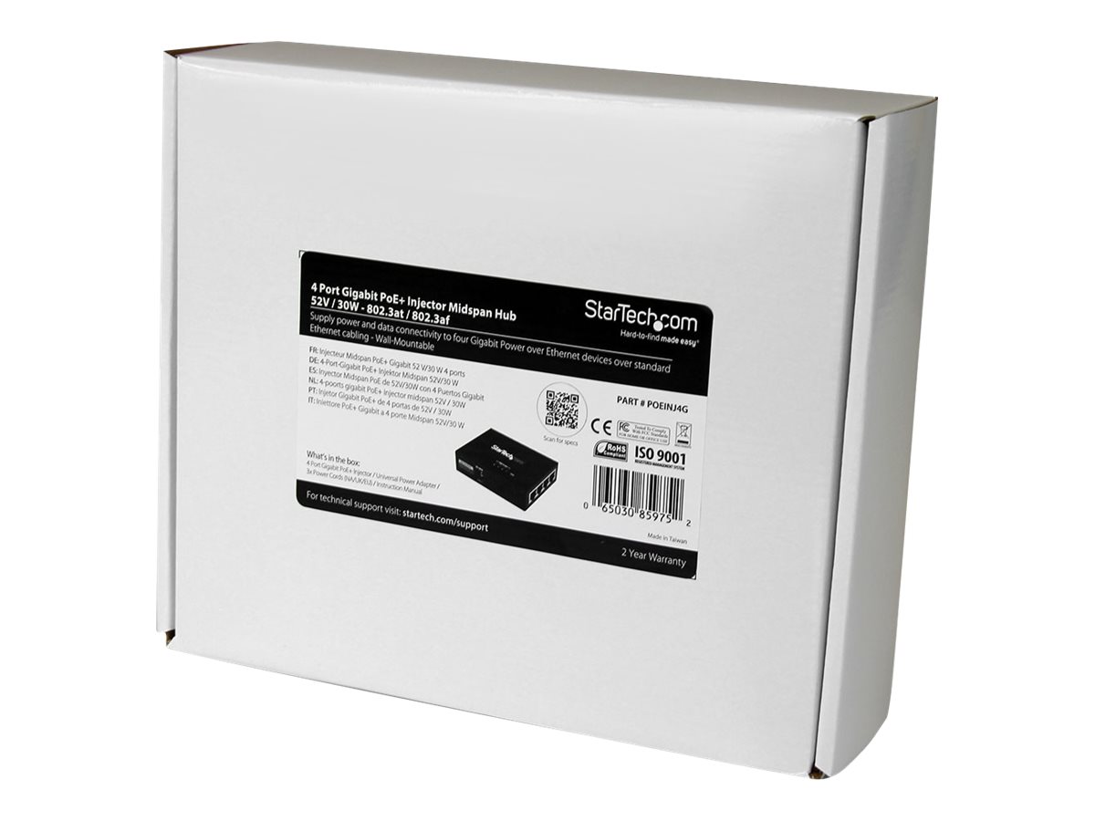 | Popis výrobku | StarTech.com 4 Port Gigabit Midspan - PoE+ Injector - 802.3at and 802.3af - Wall-mountable Power over Ethernet Midspan (POEINJ4G) - dávkovač energie - 120 Watt |