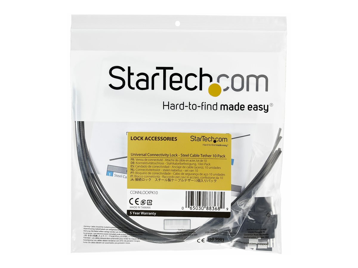 | Popis výrobku | StarTech.com 10-Pack Security Cable Tethers for Adapters & Dongles, Universal Cable Adapter Tether, Tether Cables, Adjustable Length Anti-Theft Cable Tether Lock Kit, Steel Cable Tether - Dongle Cable Tether (CONNLOCKPK10) - bezpečnostní kabel - kompatibilní s TAA |