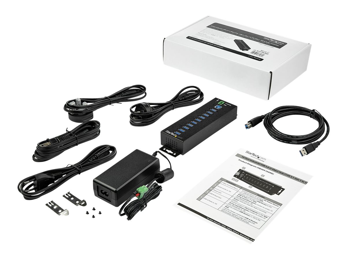 | Popis výrobku | StarTech.com 10 Port USB Hub with Power Adapter, Surge Protection, Metal Industrial USB 3.0 Data Transfer Hub, Din Rail, Wall or Desk Mountable, High Speed USB 3.1/ USB 3.2 Gen 1 5Gbps Hub - Windows/macOS/Linux (HB30A10AME) - rozbočovač - 10 porty - kompatibilní s TAA |