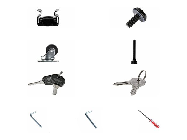 | Obsah balíčku | 2 side panel and frame, 4 upper and lower beams, vrchní panel, 2 bottom panel with cable management slot, bottom panel (solid), přední dvířka, zadní dveře, 8 plastic corner caps, 8 M8-20 hex screws, 8 M8 spring washers, 8 M4-10 flat head screws, 4 M6-12 hex screws, 6 M5-12 screws, M6 hex key, M8 hex key, 24 M6-12 Phillips screws, 24 klecových matic M6, 24 M6 plastic cup washers, 2 kolečka, 2 casters with locking device, 16 M6-10 Phillips bolts, 4 vyrovnávací nožky, 2 klíče dveří, 2 klíče pro boční panel, 2 door hinge pins, šroubovák Phillips |