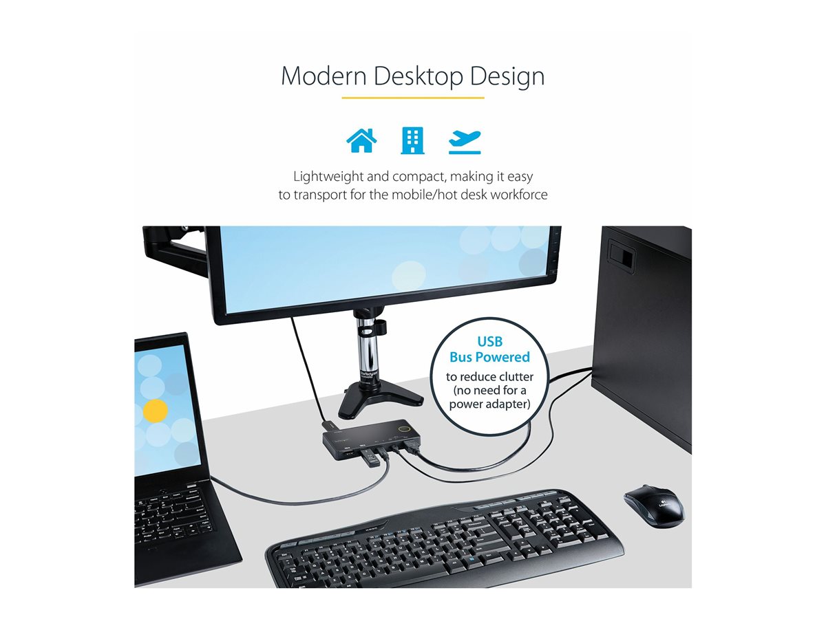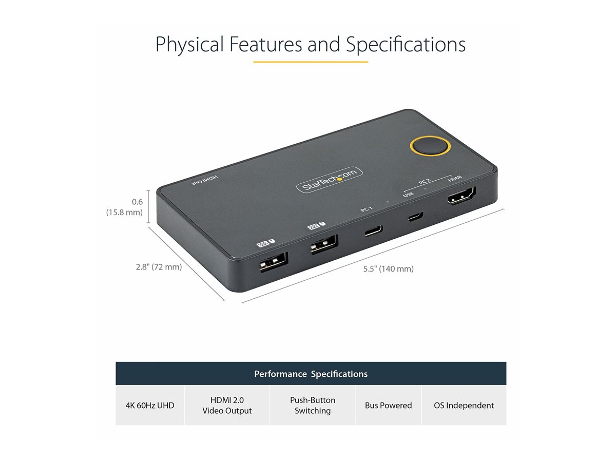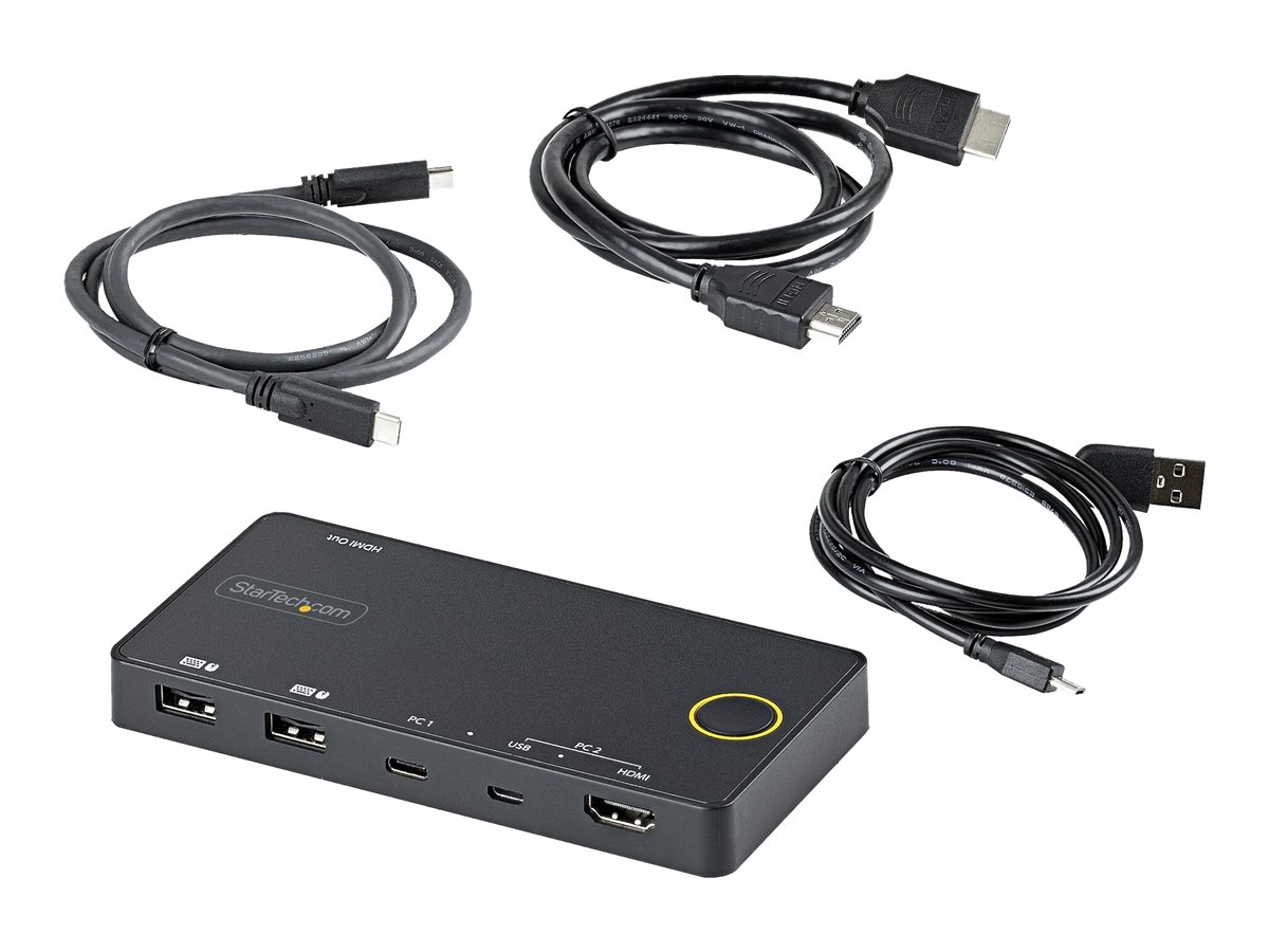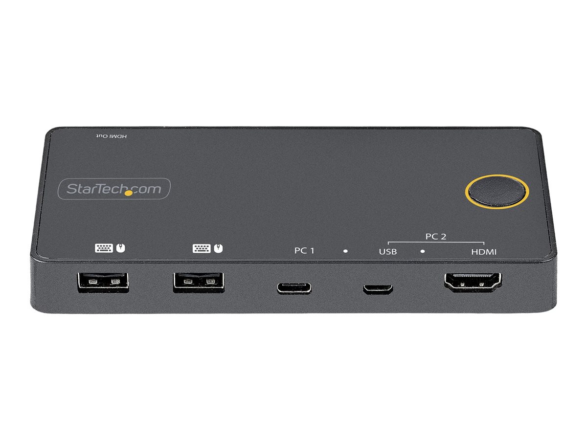 Hybridní KVM přepínač StarTech.com s 2 porty USB-A + HDMI a USB-C umožňuje plynulé připojení více zařízení a podporuje maximální rozlišení videa 3840 x 2160 při obnovovací frekvenci 60 Hz. Tento kompaktní KVM přepínač je navržen pro pohodlné ovládání dvou počítačů nebo audio zařízení pomocí jediného monitoru HDMI a zároveň zajišťuje efektivní výkon prostřednictvím USB připojení. Jeho robustní konstrukce zajišťuje spolehlivost a soulad s různými normami, jako jsou FCC a RoHS, a poskytuje efektivní řešení pro různá prostředí s provozními teplotami od 5 °C do 55 °C a vlhkostí 20–80 % RH. Díky napájení z USB sběrnice zjednodušuje tento KVM přepínač nastavení stolního počítače a umožňuje snadné přepínání mezi zařízeními. Kompaktní provedení usnadňuje umístění v jakémkoli pracovním prostoru bez snížení výkonu nebo použitelnosti, což z něj činí cenný nástroj pro uživatele, kteří chtějí maximalizovat produktivitu. Tento produkt s praktickými funkcemi se také vyznačuje průměrnou dobou mezi poruchami (MTBF) 50 000 hodin, což zajišťuje dlouhodobou spolehlivost při každodenním používání.