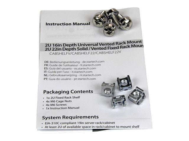 | Popis výrobku | StarTech.com 2U Fixed Server Rack Mount Shelf, 22in Deep Steel Universal Cantilever Tray for 19" AV/Data/Network Equipment Rack with Cage Nuts & Screws, 50lbs Weight Capacity, 22" Deep - 2U Network Rack Shelf (CABSHELF22) - police skříně - 2U |