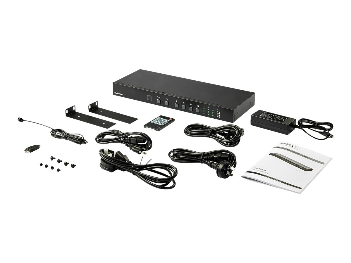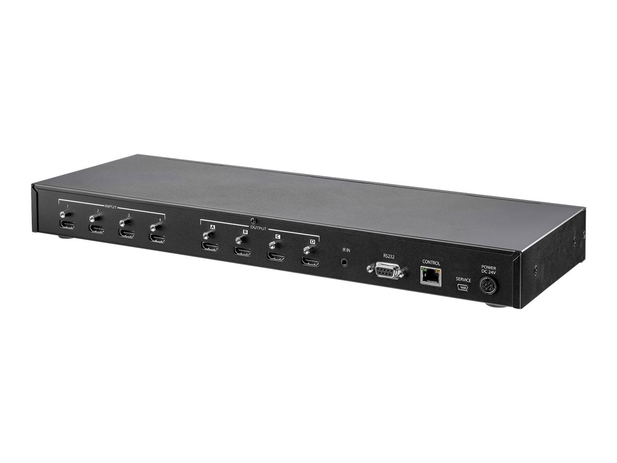 Matricový přepínač StarTech.com 4x4 HDMI s ovládáním zvuku a Ethernetem umožňuje plynulé a efektivní přepínání obrazu a zvuku mezi více zdroji HDMI a displeji. Tento matricový přepínač podporuje rozlišení 4K při 60 Hz a zajišťuje vysokou kvalitu obrazu, takže je vhodný pro monitorovací a vysílací systémy v různých prostředích. Zařízení obsahuje sadu pro montáž do racku pro snadnou instalaci a je dodáváno s externím napájecím adaptérem, který zajišťuje spolehlivý zdroj napájení pro plynulou funkci všech připojených zařízení.