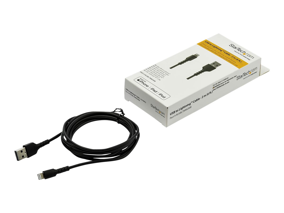 | Popis výrobku | StarTech.com 6 ft(2m) Durable Black USB-A to Lightning Cable, Heavy Duty Rugged Aramid Fiber USB Type A to Lightning Charger/Sync Power Cord, Apple MFi Certified iPad/iPhone 12 Pro Max - iPhone 7/8/11/11 Pro - kabel Lightning - Lightning / USB - 2 m |