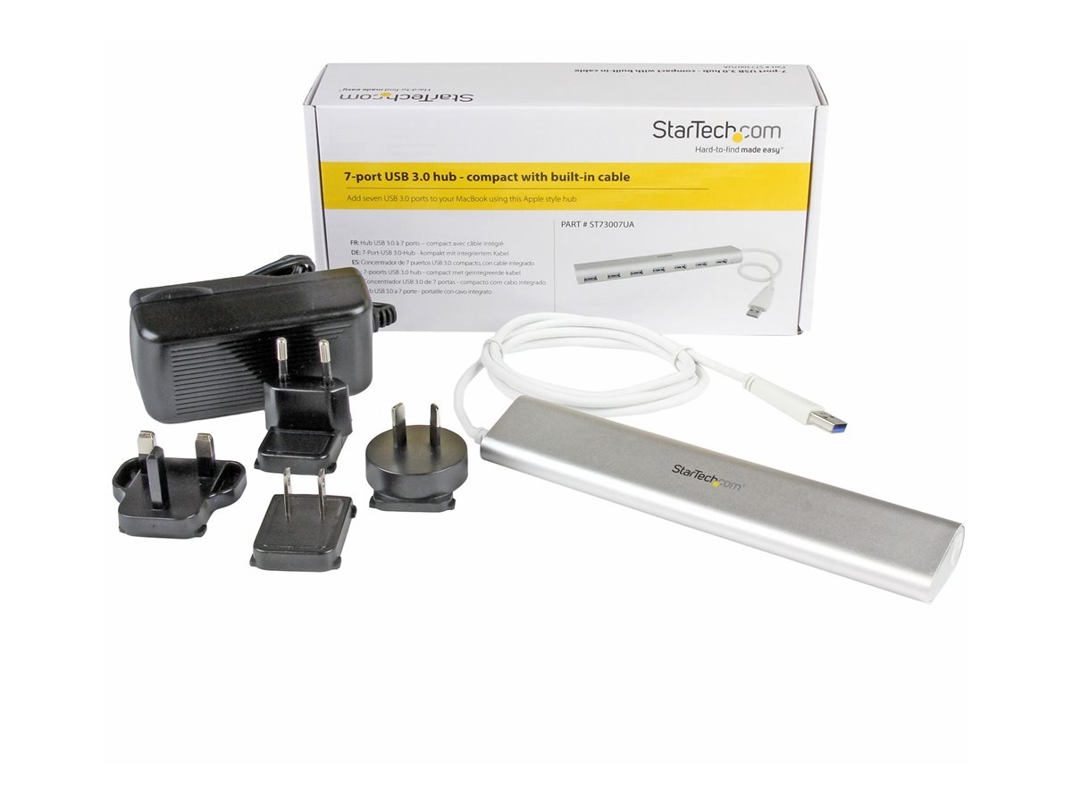 | Popis výrobku | StarTech.com 7 Port Compact USB 3.0 Hub with Built-in Cable - Aluminum USB Hub - Silver USB3 Hub with 20W Power Adapter (ST73007UA) - USB periferní sharing switch - 7 porty |