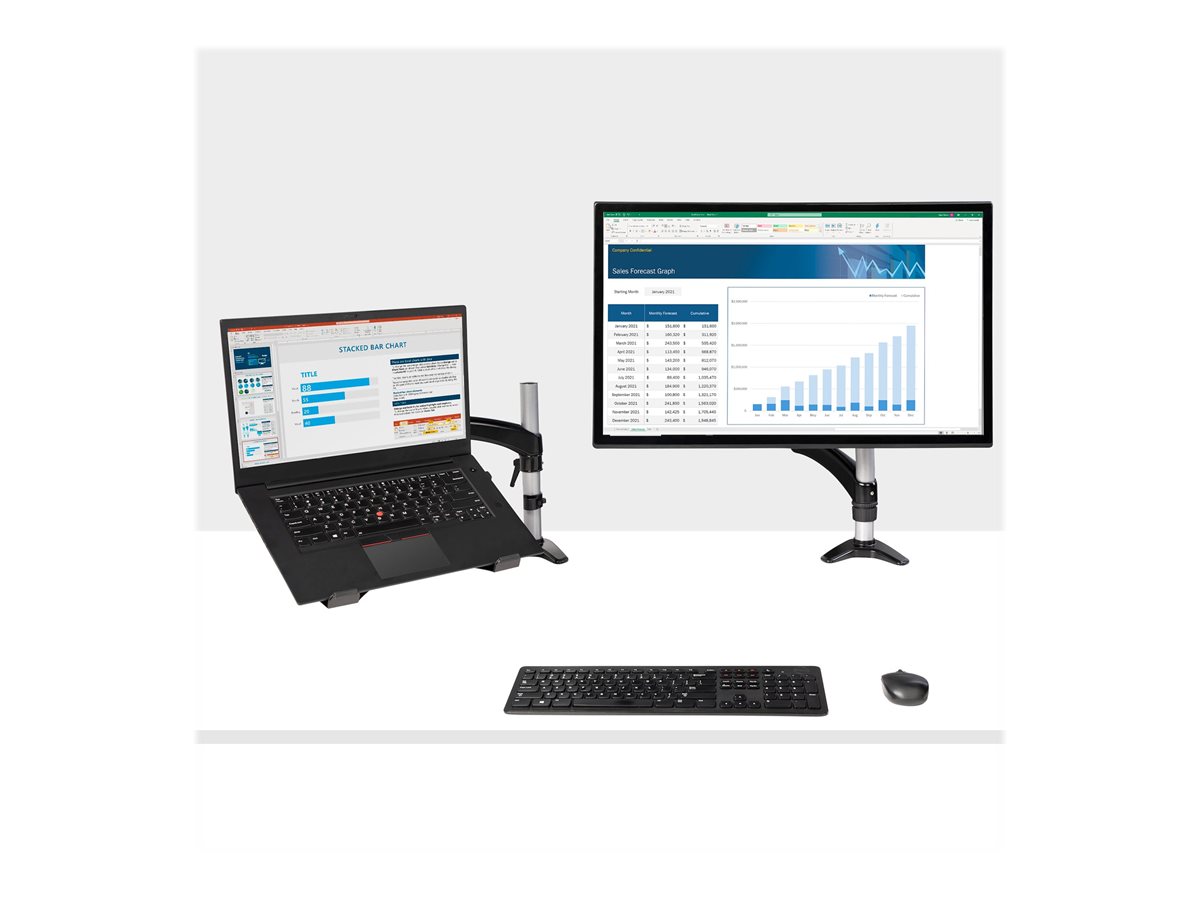 Rameno pro notebooky s upevněním na stůl od StarTech.com nabízí univerzální řešení pro umístění monitoru a notebooku. Je navrženo pro plně pohyblivé nastavení a umožňuje snadné naklápění, otáčení a otočení pro dosažení optimálního úhlu pohledu. S doporučenou velikostí displeje až 34 palců se tento hliníkový stojan hodí pro různé konfigurace a zároveň integruje správu kabelů pro čistý pracovní prostor.