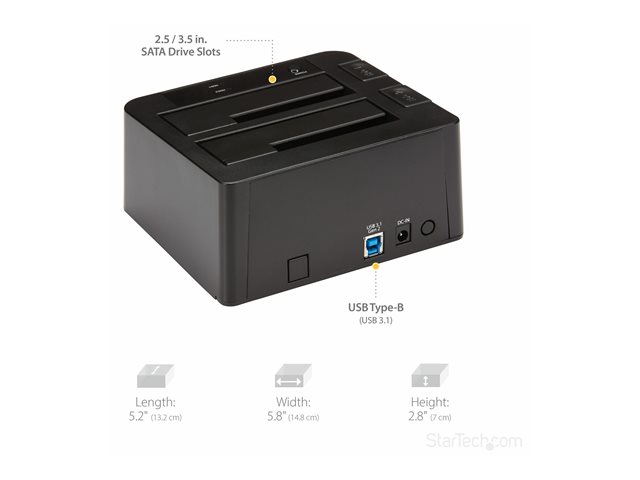 | Popis výrobku | StarTech.com Dual-Bay USB 3.1 to SATA Hard Drive Docking Station, USB 3.1 (10 Gbps) Hard Drive Dock, External 2.53.5 SATA IIIIII, SSDHDD Docking Station, Hot-Swap Hard Drive Bay - Top-Loading - řadič úložiště - USB 3.1 (Gen 2) |