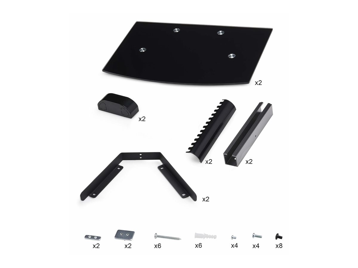 | Obsah balení | 2 podpůrné držáky na policích, 2 tempered glass shelf, 4 sided covers, 4 x M4x6 screws, 4 x šroub M5x14, 8 x šrouby M6x8, stěnný držák, 4 wall mounting screws, 4 x kotevní šrouby, 2 x endcaps, 2 large mounting plate, 2 small mounting plate |