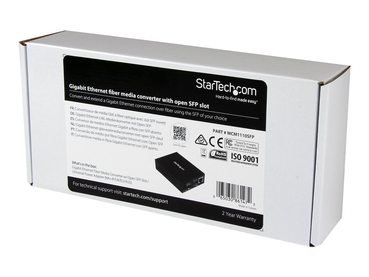 | Popis výrobku | StarTech.com Multimode / Single Mode Fiber Media Converter - Open SFP Slot - 10/100/1000Mbps RJ45 Port - LFP Supported - IEEE 802.1q Tag VLAN - (MCM1110SFP) - konvertor médií s optickými vlákny - 10Mb LAN, 100Mb LAN, 1GbE |