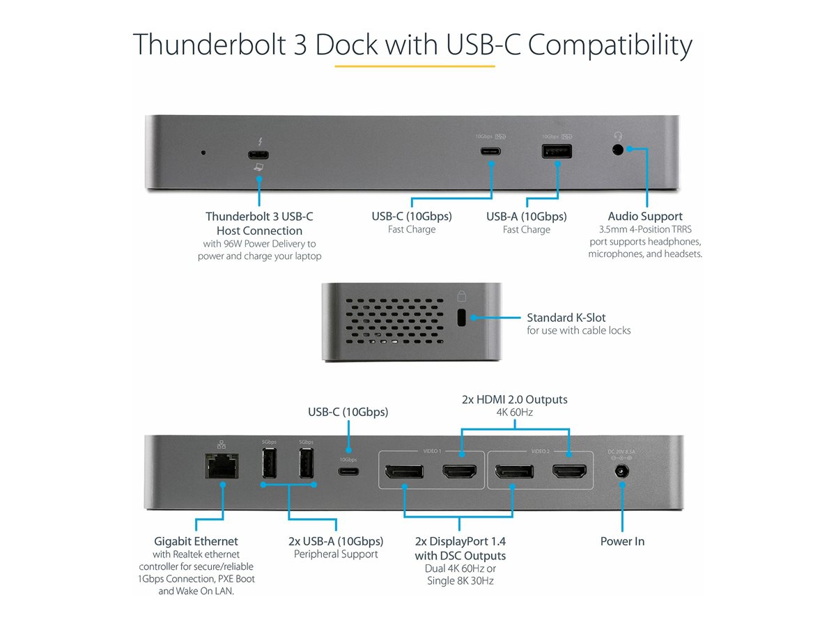 | Popis výrobku | StarTech.com Thunderbolt 3 Dock with USB-C Host Compatibility, Dual 4K 60Hz DisplayPort 1.4 or Dual HDMI 2.0 Monitors, Single 8K, TB3/USB-C Laptop Docking Station, 96W PD, 5x USB, 10Gbps - 96W Power Delivery (TB3CDK2DHUE) - dokovací stanice - USB-C 3.2 Gen 2 / Thunderbolt 3 - 2 x HDMI, 2 x DP - 1GbE |