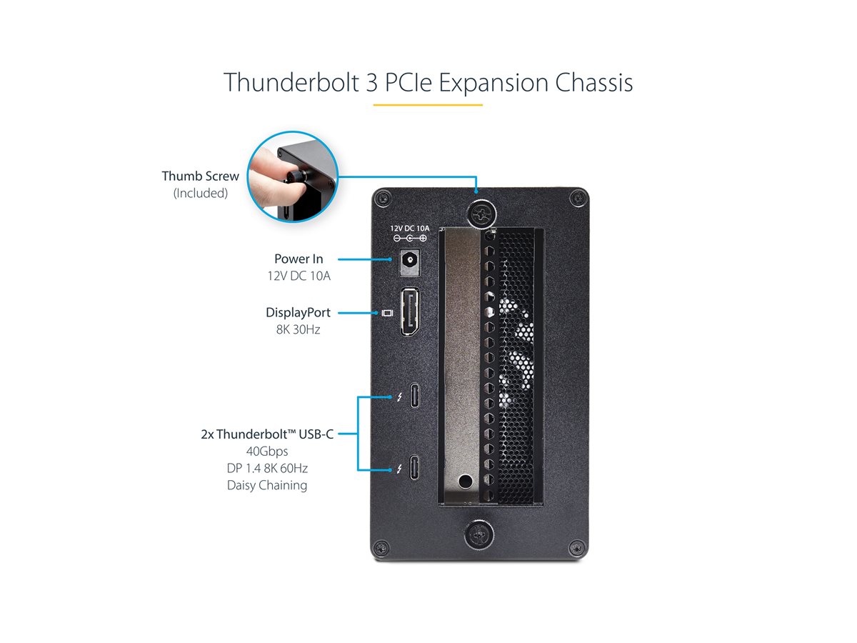 | Popis výrobku | StarTech.com Thunderbolt 3 PCIe Expansion Chassis, Enclosure Box W/Dual PCI-E Slots, External PCIe Slots for Laptops/Desktops/All-In-Ones, 8K/4K Output Via TB3/DP 1.4 Ports - For PCI Express Cards (2TBT3-PCIE-ENCLOSURE) - systémový bus extender - DP - kompatibilní s TAA |